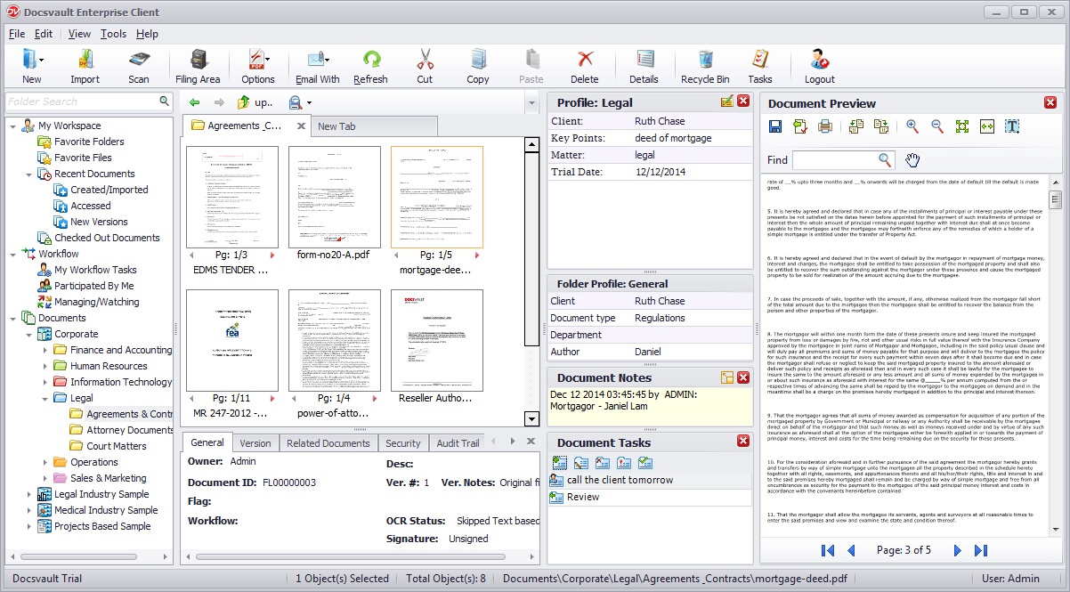 oRight Panel: Here on the right hand size, Docsvault provides you with all additional information about the currently selected file. Details such as: profile, any related notes or tasks and reminders that are associated with an item can be found in this panel.