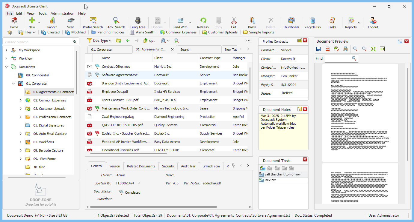 oRight Panel: Here on the right hand size, Docsvault provides you with all additional information about the currently selected file. Details such as: profile, any related notes or tasks and reminders that are associated with an item can be found in this panel.